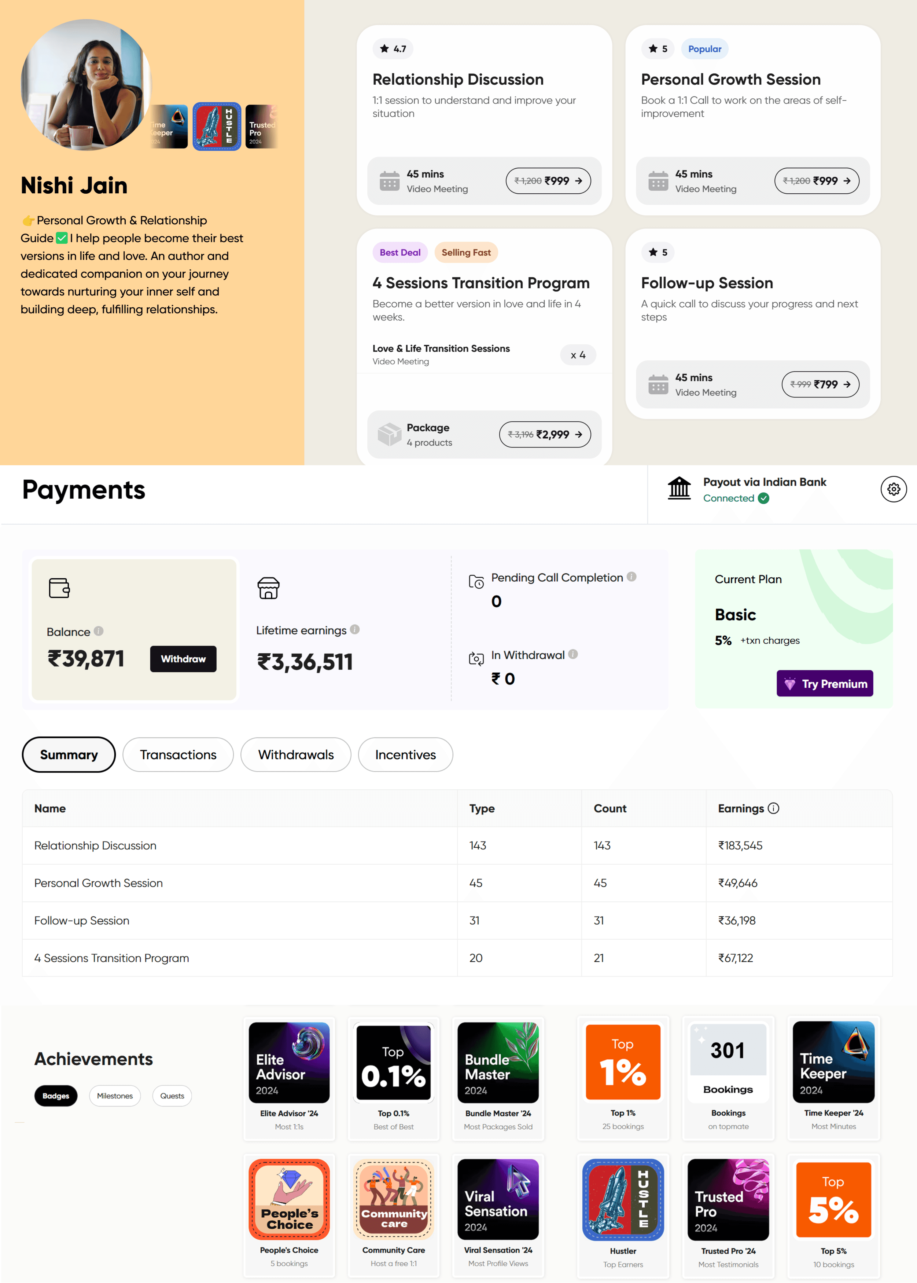 In six months, she crossed 300+ bookings and earned over ₹3L from her 1:1 sessions—all while staying true to her values.